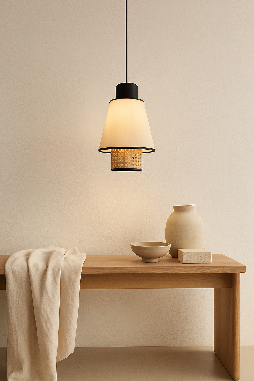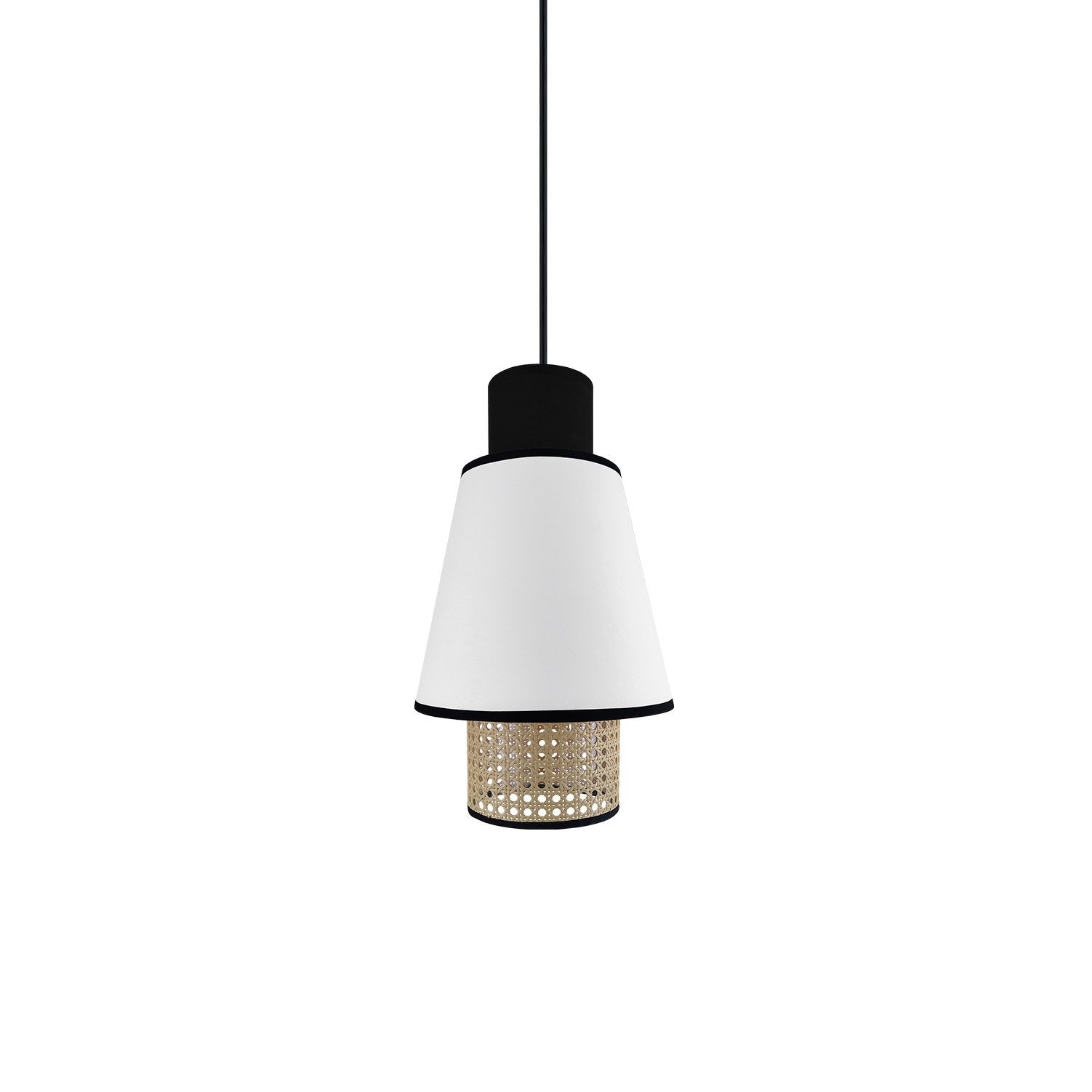 Con un diseño que une lo artesanal y lo contemporáneo, la lámpara colgante MD4644-WH destaca por su estructura de ratán natural y su doble pantalla textil, disponible en blanco o negro. Su silueta elegante y cálida es ideal para aportar personalidad y textura a comedores, cocinas o zonas de paso.